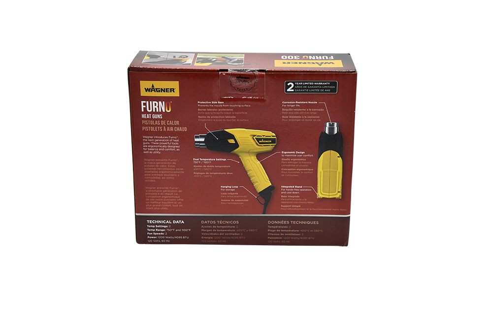 The FURNO 300 dual temperature heat gun is ideal for countless household projects such as removing paint and flooring, bending PVC, thawing frozen pipes, shrink wrapping and more. It features 2 temperature settings (1100°F on high and 750°F on low) to adjust for specific heating needs. To make your project easier, the heat gun features an ergonomic design that allows for extended comfort and balance to reduce fatigue. The integrated stand also allows for safe, hands-free operation while applying heat to a project. When you’re done with the task, simply hang the heat gun from the built-in loop on the handle.